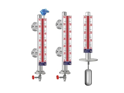 液位計根據(jù)浮力原理和磁性耦合作用研制而成。當(dāng)被測容器中的液位升降時,液位計主導(dǎo)管中的浮子也隨之升降,浮子內(nèi)的長久磁鋼通過磁耦合傳遞到現(xiàn)場指示器,驅(qū)動紅、白翻柱翻轉(zhuǎn)180o,當(dāng)液位上升時,翻柱由白色轉(zhuǎn)為紅色,當(dāng)液位下降時,翻柱由紅色轉(zhuǎn)為白色,指示器的紅、白界位處為容器內(nèi)介質(zhì)液位的實際高度,從而實現(xiàn)液位的指示。
